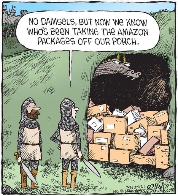 Two knights discover a dragon has been stealing their Amazon packages. Fantasy meets modern life in a genius parody of e-commerce delivery blues.