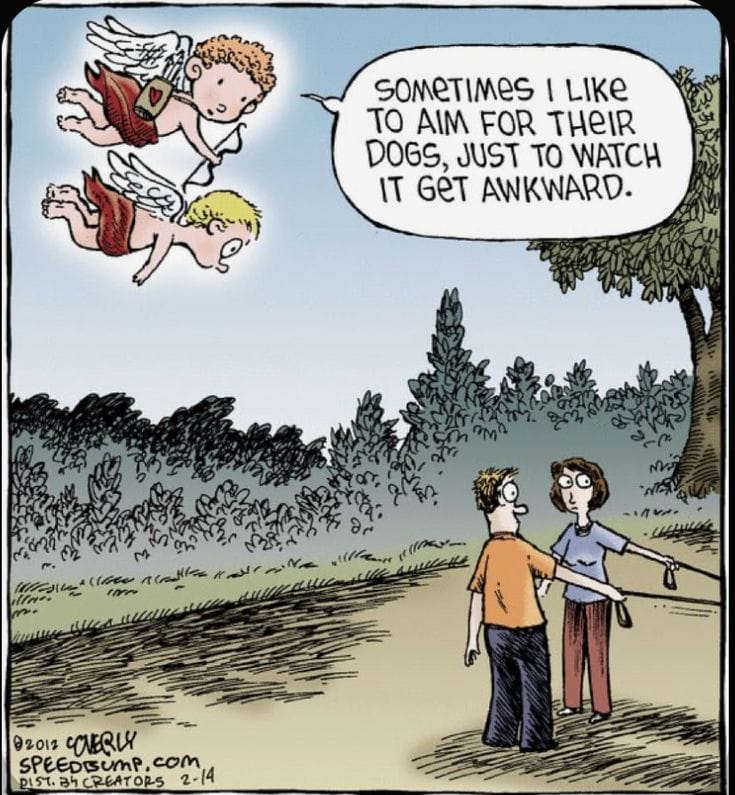 Two cherubs flying overhead admit to targeting dogs for fun. The resulting awkward human interaction below? Pure gold. It’s uncomfortable, innocent, and hilarious all at once.