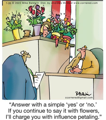 In court, a defendant uses flowers to answer questions. The judge’s threat? “I’ll charge you with influence petaling.” That pun deserves applause and maybe a bouquet.
