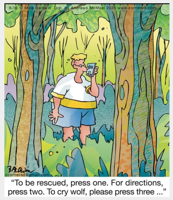 Lost in the woods and dialing 911, the poor guy reaches an automated service. “Press three to cry wolf…” This might be the darkest and funniest commentary on tech dependence yet.