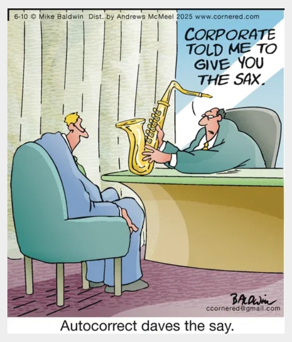 Corporate confusion takes center stage. The manager says, “Corporate told me to give you the sax.” Autocorrect chimes in with, “Daves the say.” We’re howling.