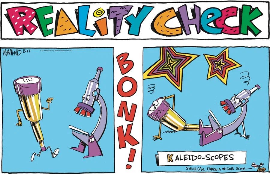 Microscopes and kaleidoscopes literally bump heads. A colorful pun that proves not all science plays nice.
