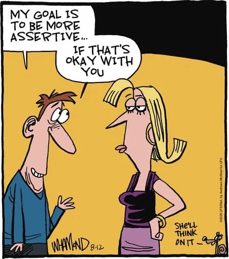 A man tries to be assertive… but asks permission to do so. Comedy gold for anyone who’s ever been too polite.