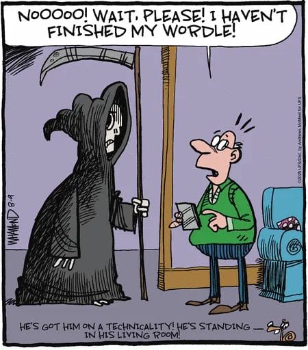A man begs the Grim Reaper for more time to finish Wordle. The most 2020s way to stall death.