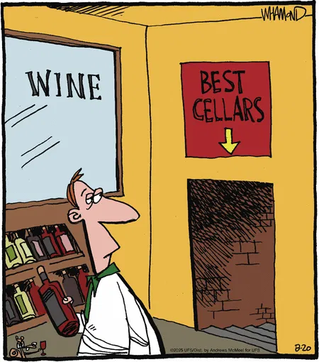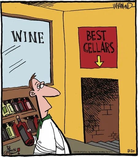 A wine shop with a sign pointing to “Best Cellars” down a creepy staircase. Delicious pun with a dark twist.
