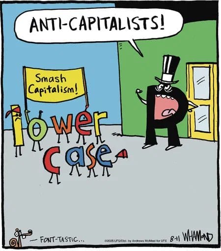 Capital letters vs. lowercase protesters. A clever political pun wrapped in typography humor. Font-tastic indeed.