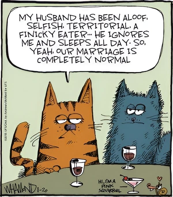 Two cats discuss marriage struggles. Aloof, selfish, finicky… oh wait, just cats being cats. Perfectly normal.