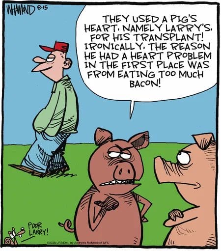 A pig laments his heart being used for a transplant—ironically because bacon caused the problem. Tragic, funny, and very meaty satire.
