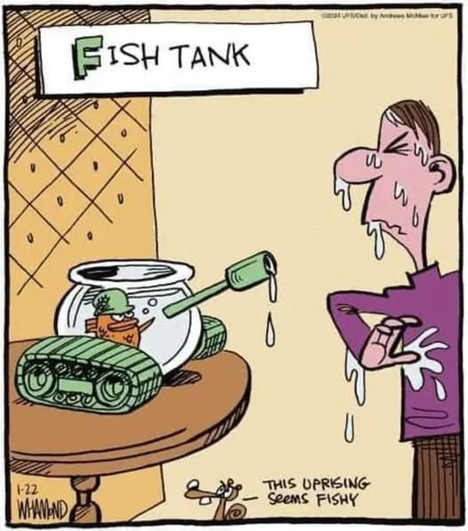 A goldfish in a tank literally runs a tank. Wet, wild, and hilariously militarized.