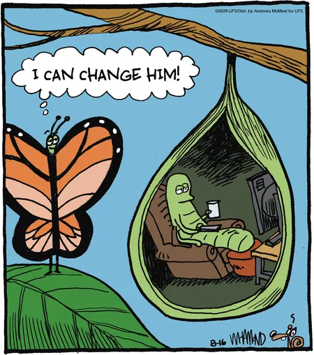 A butterfly thinks she can “change him.” Meanwhile, he lounges in his cocoon with snacks. Classic relationship satire.