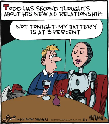 A man dates a robot who refuses intimacy because her battery is low. Proof that even AI relationships need chargers.
