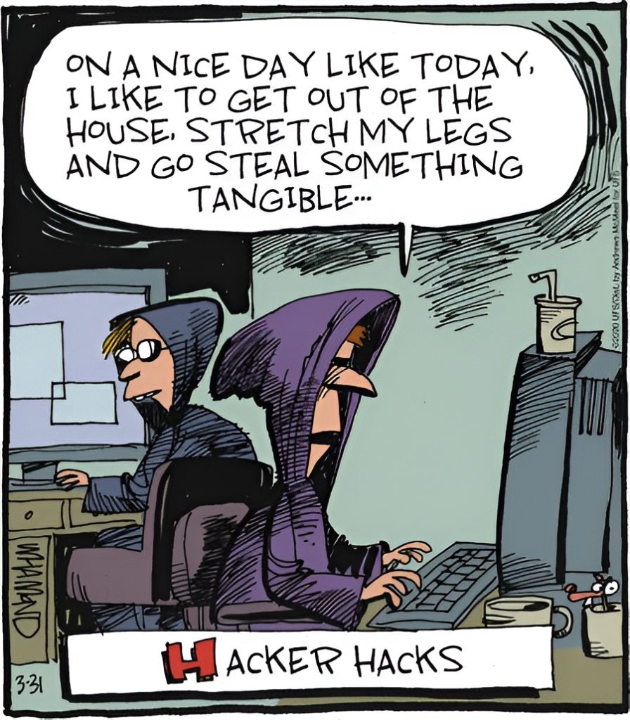 Hackers admit they sometimes miss “real” crime—like stealing tangible goods. A witty jab at digital mischief.