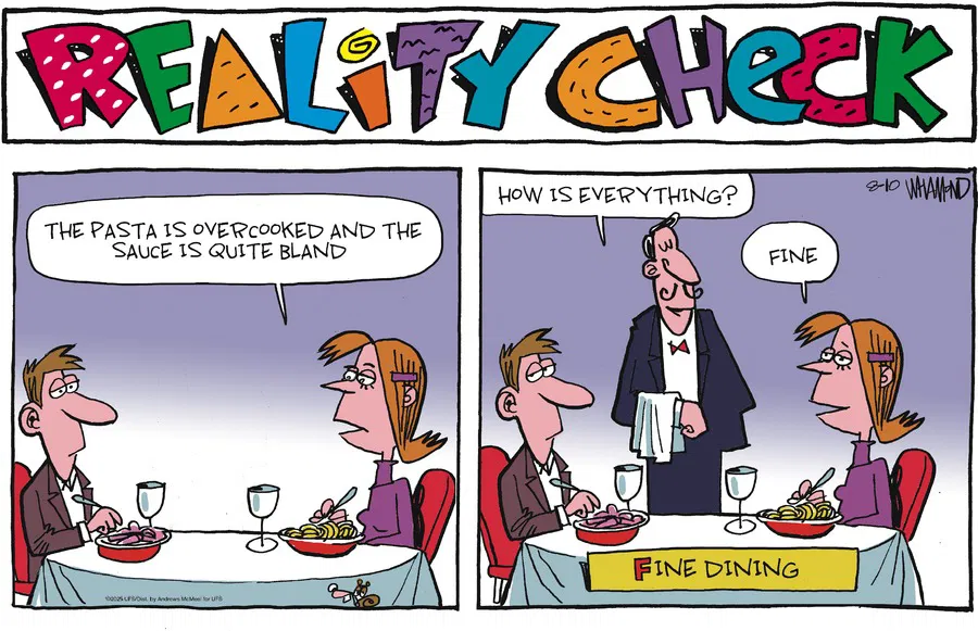 Couple complains about bad food, but when asked, they say “Fine.” A clever roast of passive-aggressive dining.