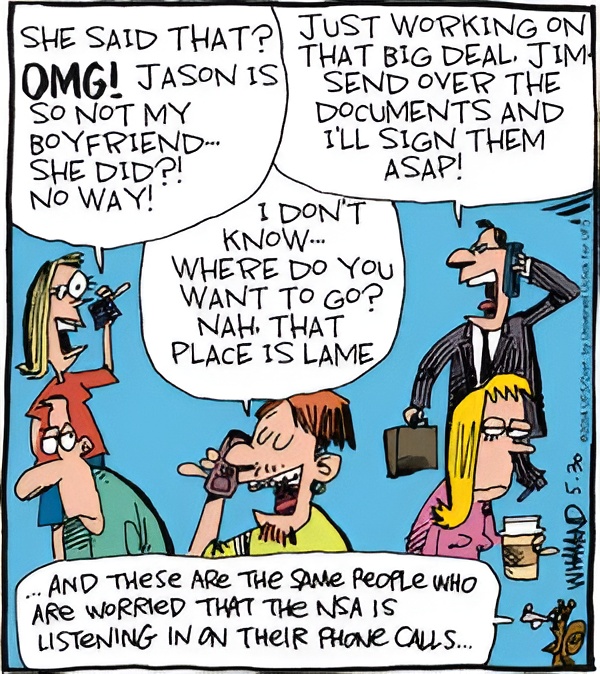 Different people rant on phones, exposing their oversharing, while worrying about surveillance. Everyday irony wrapped in comic gold.
