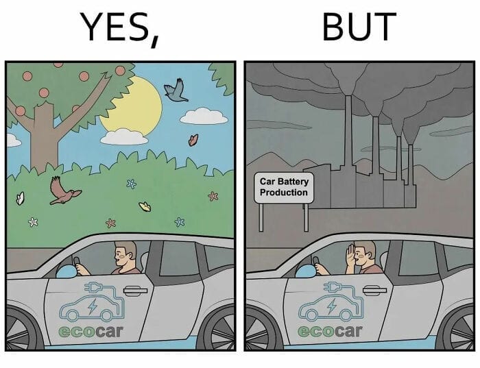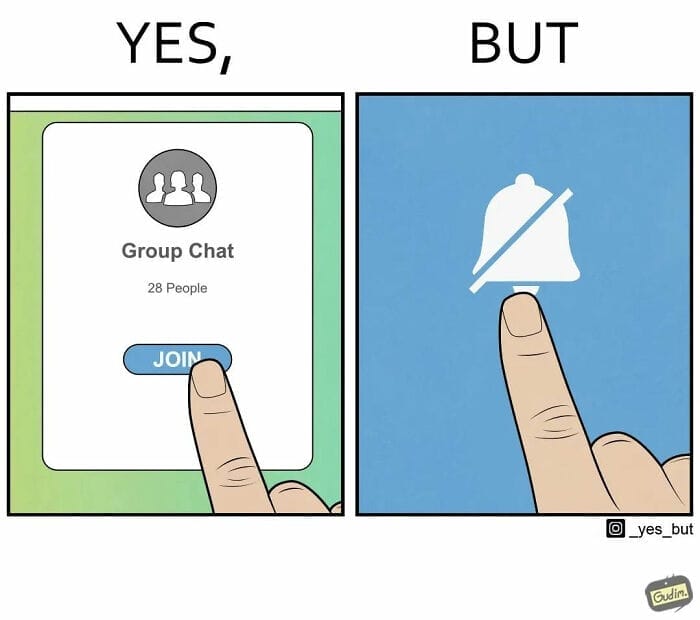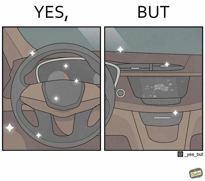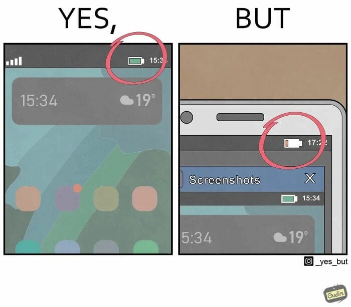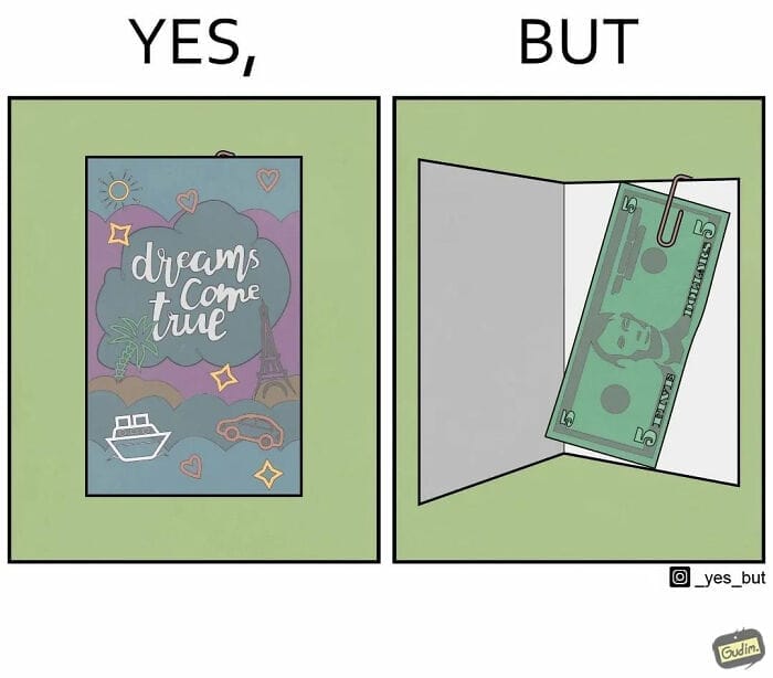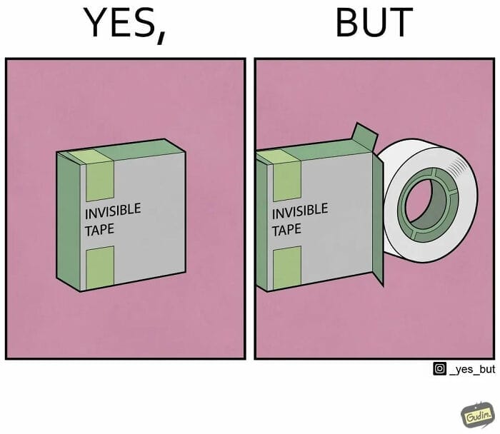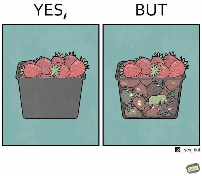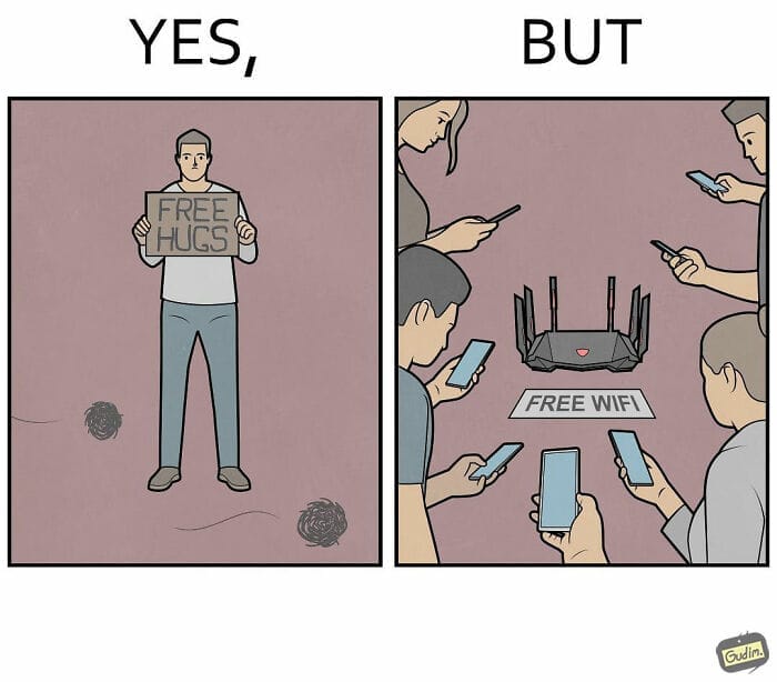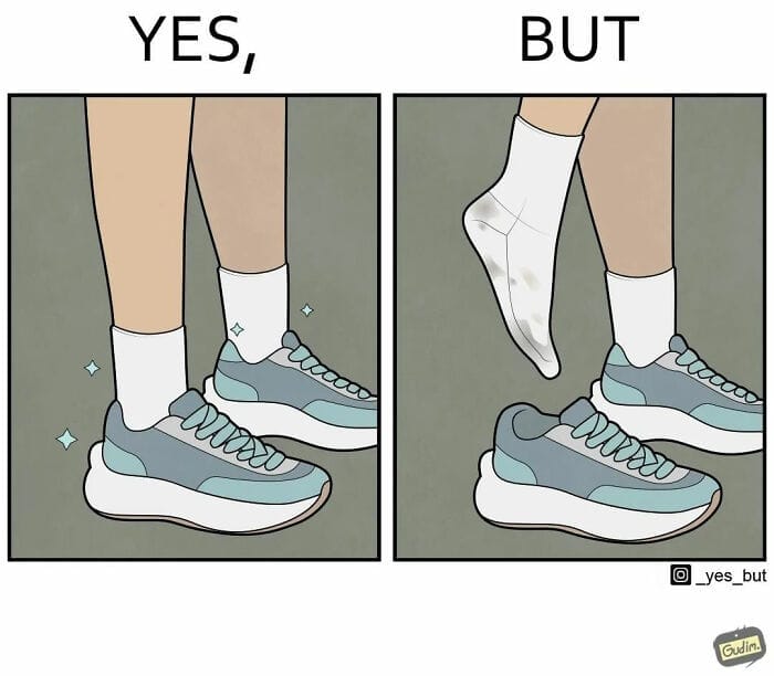 YES, BUT Comics is a series of two-panel comics created by Russian artist Anton Gudim. The comics typically depict a situation or statement in the first panel, and then the second panel provides a contradictory or unexpected twist. The comics are often humorous, but they can also be thought-provoking and satirical. The series touches on various topics such as consumerism, people’s behavior, ecology, and more. He noticed that many people engage in contradictory actions without realizing the contradictions. That’s why he wanted to explore this phenomenon.