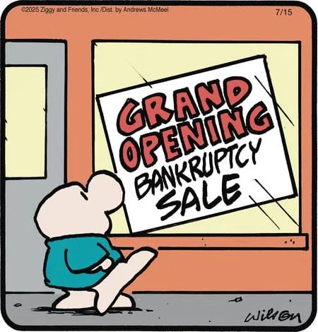 If you’ve ever seen a “Grand Opening” sign and immediately sensed doom, you’ll relate. Ziggy stumbles upon a storefront that’s skipping straight to the bankruptcy sale. It’s a masterclass in economic humor: blink and you’ll miss it, just like the shop’s profits.