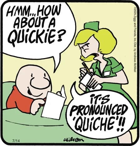 This playful panel lands a double entendre with a diner twist. Ziggy’s innocent lunch order leads to the waitress’s deadpan correction: “It’s pronounced quiche!” The strip balances cheeky humor with family-friendly charm—just enough sass to keep you grinning.