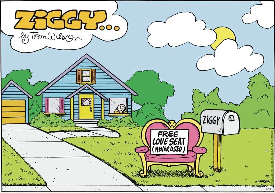 Ziggy’s yard sign promises a “free loveseat (never used)”—a visual joke that’s equal parts clever and a little too real. Who among us hasn’t bought furniture for a love life that never materialized? It’s bittersweet and brilliant, all at once.