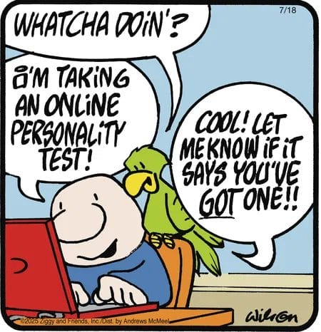 Ziggy’s taking an online personality test when his parrot cuts in with a savage line: “Let me know if it says you’ve got one!” Roasted by your own pet? The internet dreams of this kind of energy.