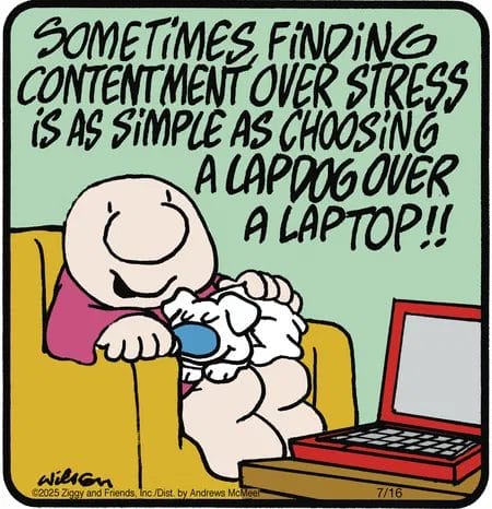 Some life choices are easy: adorable dog vs. stressful laptop? Ziggy’s got it right. This wholesome strip is a reminder to unplug, unwind, and snuggle something fluffy instead of doom-scrolling. Bonus points if your lapdog is actually a cat, but hey, we won’t judge.