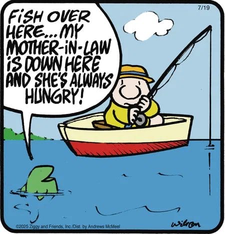 Mother-in-law jokes: still a classic. Ziggy chats up the fish with a playful jab at his mother-in-law’s appetite. It’s harmless fun, the kind that gets a knowing chuckle from anyone who’s ever endured family fishing trips or, well, family.