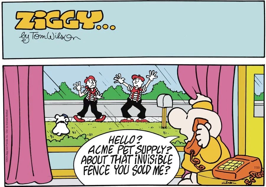 Mime trouble! After buying an “invisible fence,” Ziggy is left with a couple of escape artists performing in his yard. The visual punchline, with panicked mimes and a very unconvinced dog, is an instant classic for anyone who’s ever bought a product that definitely didn’t do what it promised.